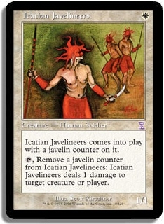 Icatian Javelineers comes into play with a javelin counter on it. T, Remove a javelin counter from Icatian Javelineers: Icatian Javelineers deals 1 damage to target creature or player.