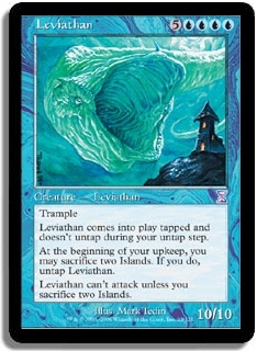 Trample Leviathan comes into play tapped and doesn't untap during your untap step. At the beginning of your upkeep, you may sacrifice two Islands. If you do, untap Leviathan. Leviathan can't attack unless you sacrifice two Islands.