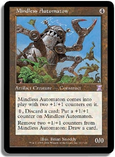 Mindless Automaton comes into play with two +1/+1 counters on it. 1, Discard a card: Put a +1/+1 counter on Mindless Automaton. Remove two +1/+1 counters from Mindless Automaton: Draw a card.