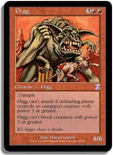 Trample Orgg can't attack if defending player controls an untapped creature with power 3 or greater. Orgg can't block creatures with power 3 or greater.