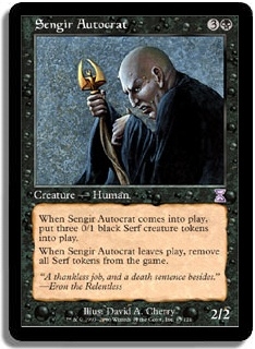 When Sengir Autocrat comes into play, put three 0/1 black Serf creature tokens into play. When Sengir Autocrat leaves play, remove all Serf tokens from the game.