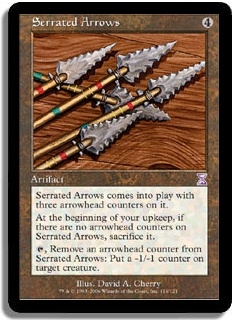 Serrated Arrows comes into play with three arrowhead counters on it. At the beginning of your upkeep, if there are no arrowhead counters on Serrated Arrows, sacrifice it. T, Remove an arrowhead counter from Serrated Arrows: Put a -1/-1 counter on target creature.