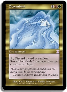 2, Discard a card at random: Stormbind deals 2 damage to target creature or player.