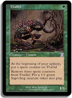 At the beginning of your upkeep, put a spore counter on Thallid. Remove three spore counters from Thallid: Put a 1/1 green Saproling creature token into play.