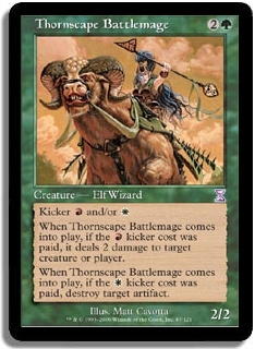 Kicker R and/or W When Thornscape Battlemage comes into play, if the R kicker cost was paid, it deals 2 damage to target creature or player. When Thornscape Battlemage comes into play, if the W kicker cost was paid, destroy target artifact.
