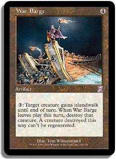 3: Target creature gains islandwalk until end of turn. When War Barge leaves play this turn, destroy that creature. A creature destroyed this way can't be regenerated.