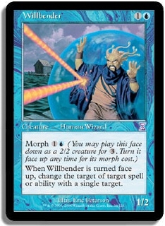 Morph 1U (You may play this face down as a 2/2 creature for 3. Turn it face up any time for its morph cost.) When Willbender is turned face up, change the target of target spell or ability with a single target.