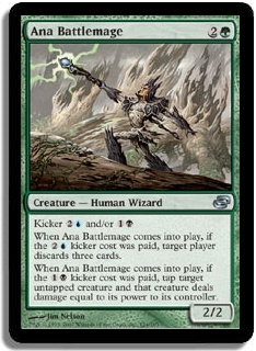 Kicker 2U and/or 1B When Ana Battlemage comes into play, if the 2U kicker cost was paid, target player discards three cards. When Ana Battlemage comes into play, if the 1B kicker cost was paid, tap target untapped creature and that creature deals damage equal to its power to its controller.
