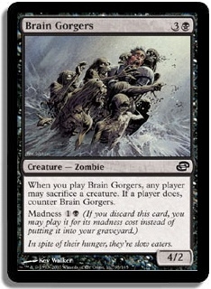 When you play Brain Gorgers, any player may sacrifice a creature. If a player does, counter Brain Gorgers. Madness 1B (If you discard this card, you may play it for its madness cost instead of putting it into your graveyard.)