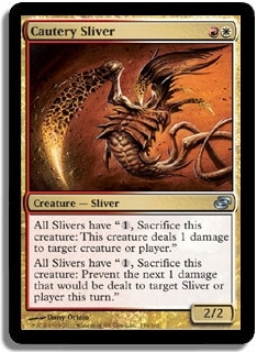 All Slivers have "1, Sacrifice this creature: This creature deals 1 damage to target creature or player." All Slivers have "1, Sacrifice this creature: Prevent the next 1 damage that would be dealt to target Sliver or player this turn."