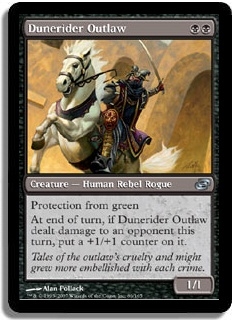 Protection from green At end of turn, if Dunerider Outlaw dealt damage to an opponent this turn, put a +1/+1 counter on it.