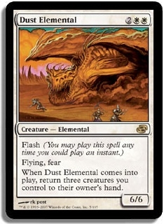 Flash (You may play this spell any time you could play an instant.) Flying, fear When Dust Elemental comes into play, return three creatures you control to their owner's hand.