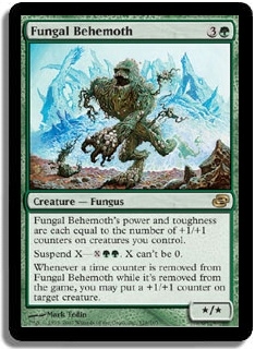 Fungal Behemoth's power and toughness are each equal to the number of +1/+1 counters on creatures you control. Suspend X-XGG. X can't be 0. Whenever a time counter is removed from Fungal Behemoth while it's removed from the game, you may put a +1/+1 counter on target creature.