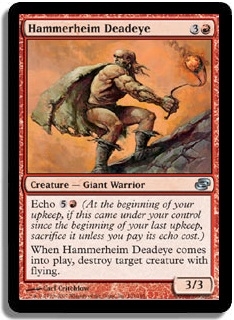 Echo 5R (At the beginning of your upkeep, if this came under your control since the beginning of your last upkeep, sacrifice it unless you pay its echo cost.) When Hammerheim Deadeye comes into play, destroy target creature with flying.