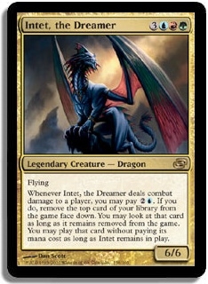 Flying Whenever Intet, the Dreamer deals combat damage to a player, you may pay 2U. If you do, remove the top card of your library from the game face down. You may look at that card as long as it remains removed from the game. You may play that card without paying its mana cost as long as Intet remains in play.