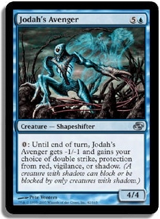 0: Until end of turn, Jodah's Avenger gets -1/-1 and gains your choice of double strike, protection from red, vigilance, or shadow. (A creature with shadow can block or be blocked by only creatures with shadow.)