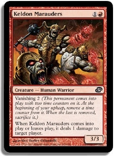 Vanishing 2 (This permanent comes into play with two time counters on it. At the beginning of your upkeep, remove a time counter from it. When the last is removed, sacrifice it.) When Keldon Marauders comes into play or leaves play, it deals 1 damage to target player.