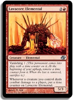 Vanishing 1 (This permanent comes into play with a time counter on it. At the beginning of your upkeep, remove a time counter from it. When the last is removed, sacrifice it.) Whenever a creature you control deals combat damage to a player, put a time counter on Lavacore Elemental.