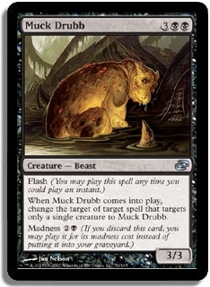 Flash (You may play this spell any time you could play an instant.) When Muck Drubb comes into play, change the target of target spell that targets only a single creature to Muck Drubb. Madness 2B (If you discard this card, you may play it for its madness cost instead of putting it into your graveyard.)