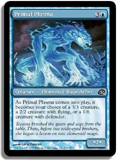 As Primal Plasma comes into play, it becomes your choice of a 3/3 creature, a 2/2 creature with flying, or a 1/6 creature with defender.