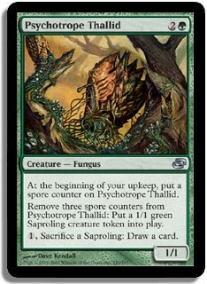 At the beginning of your upkeep, put a spore counter on Psychotrope Thallid. Remove three spore counters from Psychotrope Thallid: Put a 1/1 green Saproling creature token into play. 1, Sacrifice a Saproling: Draw a card.
