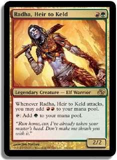 Whenever Radha, Heir to Keld attacks, you may add RR to your mana pool. T Add G to your mana pool.