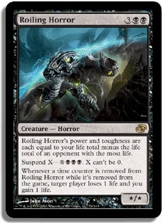Roiling Horror's power and toughness are each equal to your life total minus the life total of an opponent with the most life. Suspend X-XBBB. X can't be 0. Whenever a time counter is removed from Roiling Horror while it's removed from the game, target player loses 1 life and you gain 1 life.