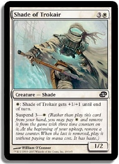 W: Shade of Trokair gets +1/+1 until end of turn. Suspend 3-W (Rather than play this card from your hand, you may pay W and remove it from the game with three time counters on it. At the beginning of your upkeep, remove a time counter. When the last is removed, play it without paying its mana cost. It has haste.)