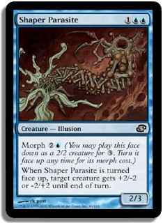 Morph 2U (You may play this face down as a 2/2 creature for 3. Turn it face up any time for its morph cost.) When Shaper Parasite is turned face up, target creature gets +2/-2 or -2/+2 until end of turn.
