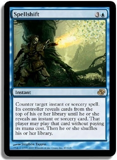 Counter target instant or sorcery spell. Its controller reveals cards from the top of his or her library until he or she reveals an instant or sorcery card. That player may play that card without paying its mana cost. Then he or she shuffles his or her library.