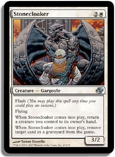 Flash (You may play this spell any time you could play an instant.) Flying When Stonecloaker comes into play, return a creature you control to its owner's hand. When Stonecloaker comes into play, remove target card in a graveyard from the game.
