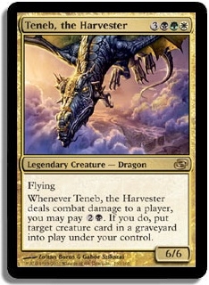 Flying Whenever Teneb, the Harvester deals combat damage to a player, you may pay 2B. If you do, put target creature card in a graveyard into play under your control.