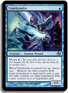 Morph U (You may play this face down as a 2/2 creature for 3. Turn it face up any time for its morph cost.) When Timebender is turned face up, choose one - Remove two time counters from target permanent or suspended card; or put two time counters on target permanent with a time counter on it or suspended card.