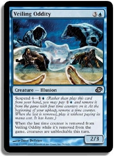 Suspend 4-1U (Rather than play this card from your hand, you may pay 1U and remove it from the game with four time counters on it. At the beginning of your upkeep, remove a time counter. When the last is removed, play it without paying its mana cost. It has haste.) When the last time counter is removed from Veiling Oddity while it's removed from the game, creatures are unblockable this turn.