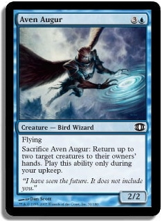 Flying Sacrifice Aven Augur: Return up to two target creatures to their owners' hands. Play this ability only during your upkeep.