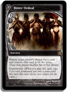 Search target player's library for a card and remove that card from the game. Then that player shuffles his or her library. Gravestorm (When you play this spell, copy it for each permanent put into a graveyard this turn. You may choose new targets for the copies.)
