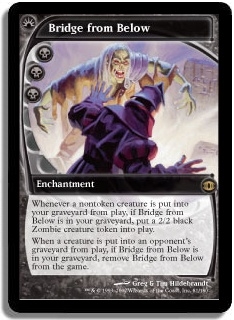 Whenever a nontoken creature is put into your graveyard from play, if Bridge from Below is in your graveyard, put a 2/2 black Zombie creature token into play. When a creature is put into an opponent's graveyard from play, if Bridge from Below is in your graveyard, remove Bridge from Below from the game.