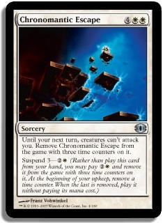 Until your next turn, creatures can't attack you. Remove Chronomantic Escape from the game with three time counters on it. Suspend 3-2W (Rather than play this card from your hand, you may pay 2W and remove it from the game with three time counters on it. At the beginning of your upkeep, remove a time counter. When the last is removed, play it without paying its mana cost.)
