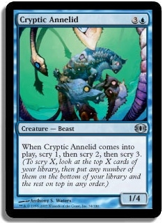 When Cryptic Annelid comes into play, scry 1, then scry 2, then scry 3. (To scry X, look at the top X cards of your library, then put any number of them on the bottom of your library and the rest on top in any order.)