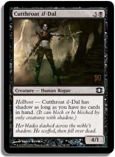 Hellbent - Cutthroat il-Dal has shadow as long as you have no cards in hand. (It can block or be blocked by only creatures with shadow.)