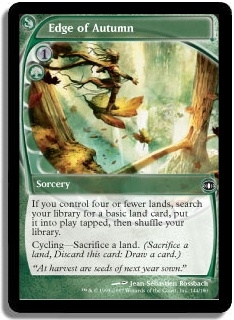 If you control four or fewer lands, search your library for a basic land card, put it into play tapped, then shuffle your library. Cycling-Sacrifice a land. (Sacrifice a land, Discard this card: Draw a card.)