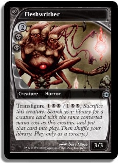 Transfigure 1BB (1BB, Sacrifice this creature: Search your library for a creature card with the same converted mana cost as this creature and put that card into play. Then shuffle your library. Play only as a sorcery.)