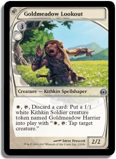 W, T, Discard a card: Put a 1/1 white Kithkin Soldier creature token named Goldmeadow Harrier into play with "W, T Tap target creature."