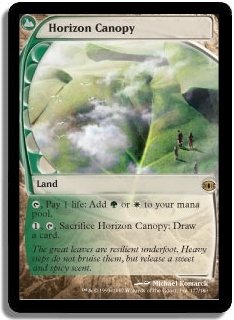 T, Pay 1 life: Add G or W to your mana pool. 1, T, Sacrifice Horizon Canopy: Draw a card.