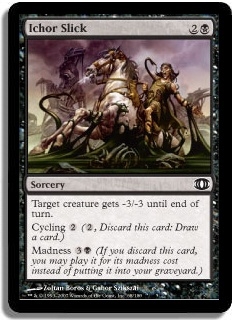 Target creature gets -3/-3 until end of turn. Cycling 2 (2, Discard this card: Draw a card.) Madness 3B (If you discard this card, you may play it for its madness cost instead of putting it into your graveyard.)