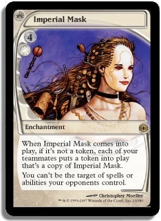 When Imperial Mask comes into play, if it's not a token, each of your teammates puts a token into play that's a copy of Imperial Mask. You can't be the target of spells or abilities your opponents control.