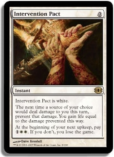 Intervention Pact is white. The next time a source of your choice would deal damage to you this turn, prevent that damage. You gain life equal to the damage prevented this way. At the beginning of your next upkeep, pay 1WW. If you don't, you lose the game.