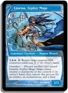 XUU, T Return target creature with converted mana cost X to its owner's hand. Grandeur - Discard another card named Linessa, Zephyr Mage: Target player returns a creature he or she controls to its owner's hand, then repeats this process for an artifact, an enchantment, and a land.