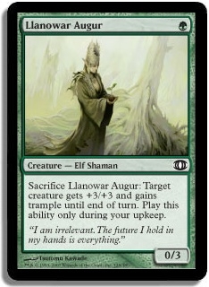 Sacrifice Llanowar Augur: Target creature gets +3/+3 and gains trample until end of turn. Play this ability only during your upkeep.