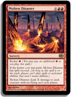 Kicker R (You may pay an additional R as you play this spell.) If the kicker cost was paid, Molten Disaster has split second. (As long as this spell is on the stack, players can't play spells or activated abilities that aren't mana abilities.) Molten Disaster deals X damage to each creature without flying and each player.